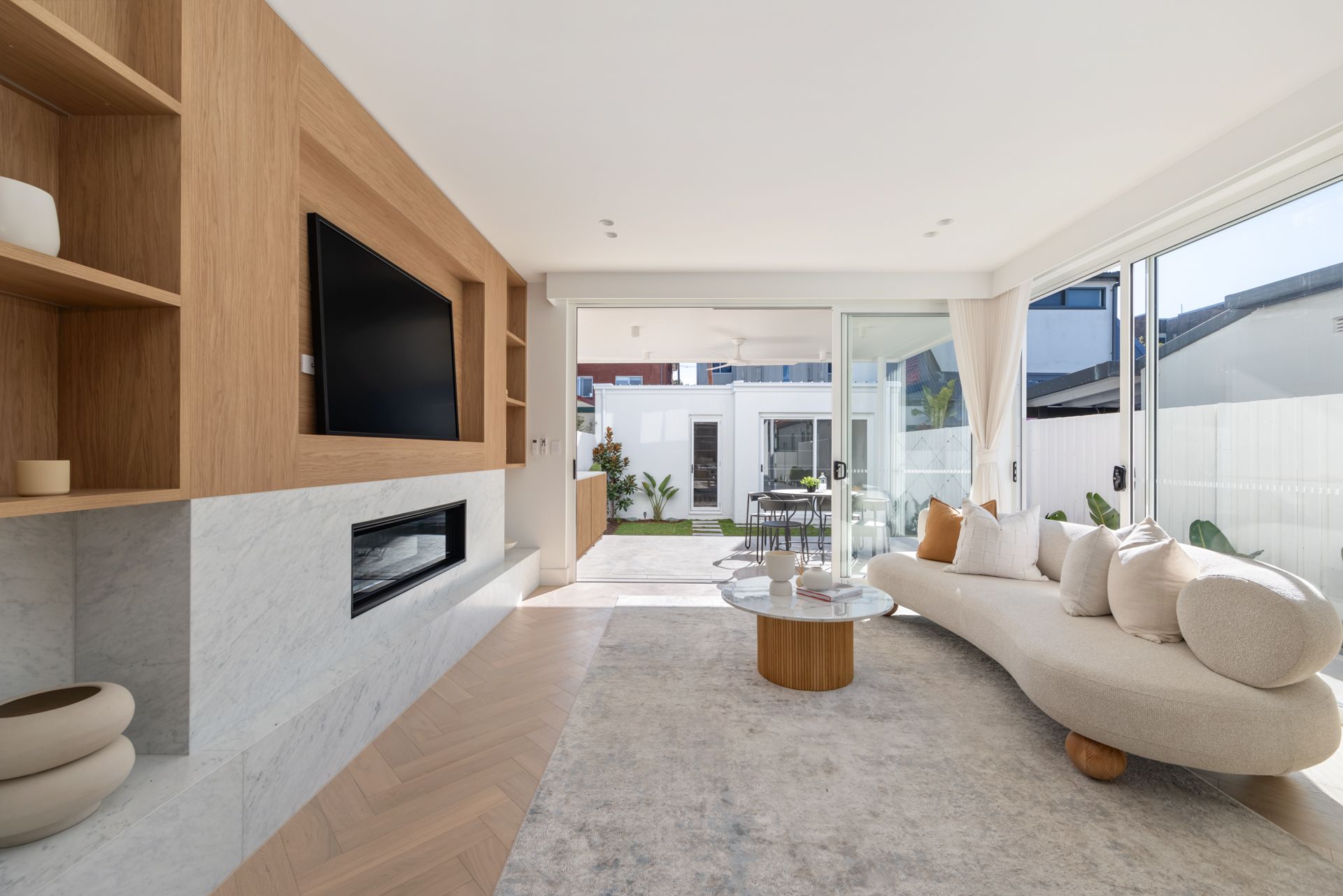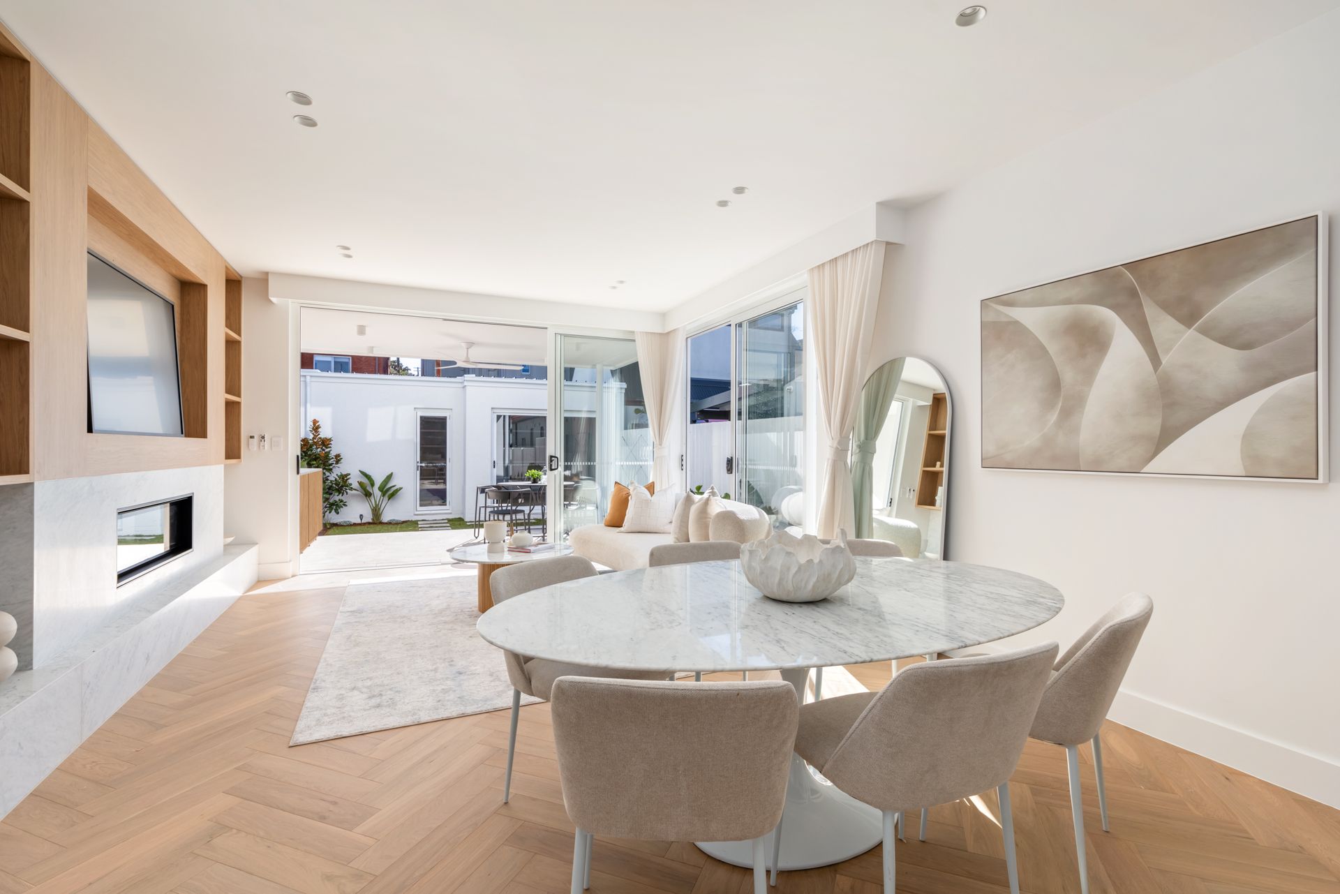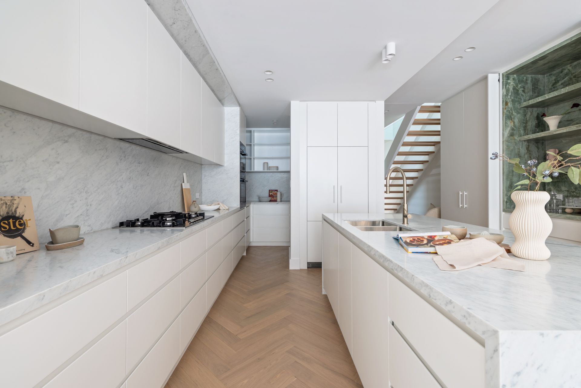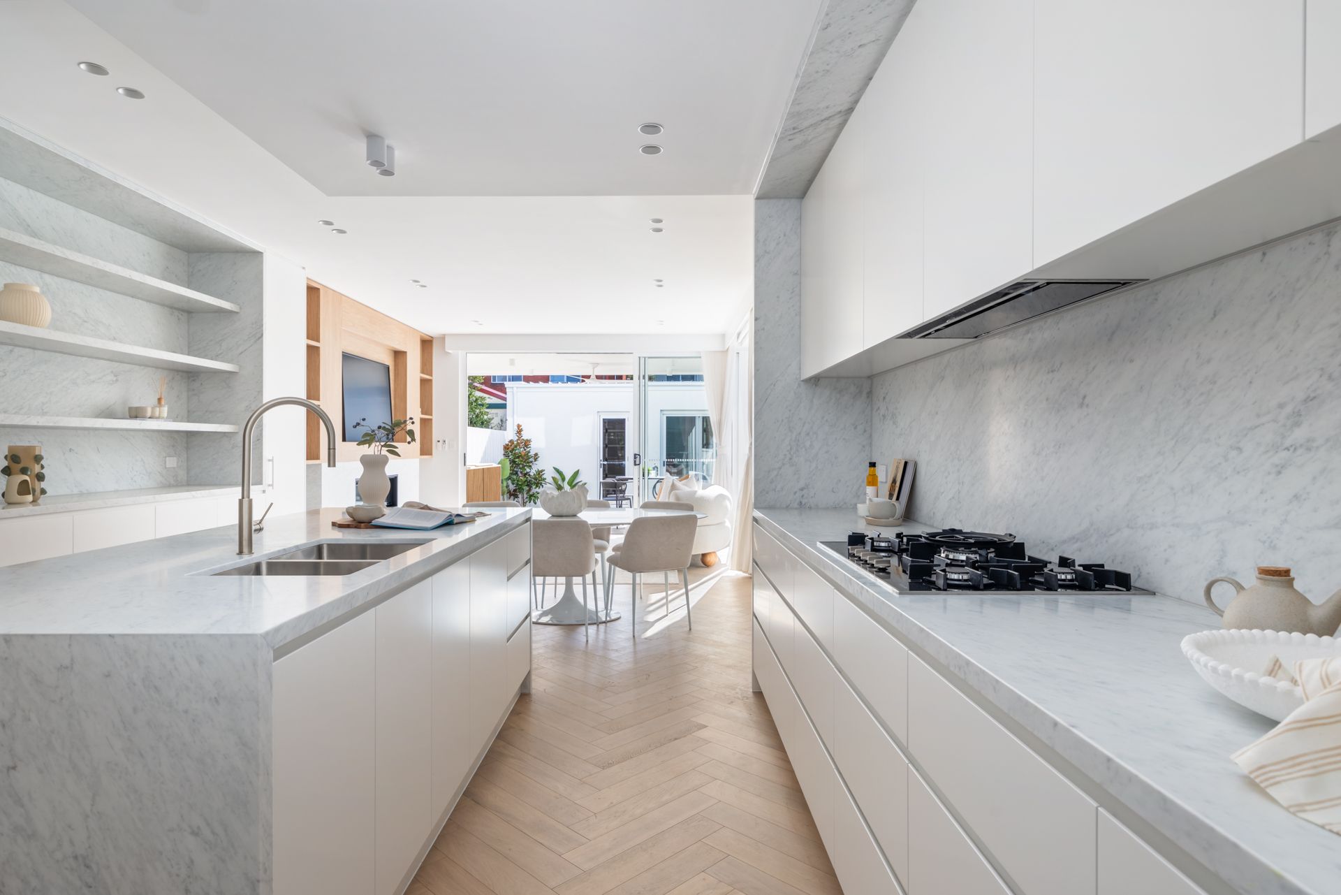 The sense of space, the natural light and the refined materiality create an ambient mood, with the meticulous calibre of workmanship evident in every corner. Bespoke details and a palette of curated finishes elevate the generous two-storey home, from luxurious marble accents and herringbone timber floors to the subtle curves of the skylights.